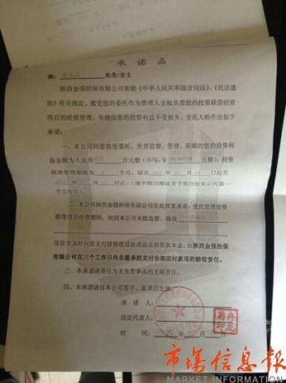 隨后,孫某立即趕到金強擔(dān)保公司,拿到了一份“因我公司資金周轉(zhuǎn)出現(xiàn)困難,無法按合同約定三日內(nèi)代償?,F(xiàn)承諾將您的名為投資、實為借款的合同在本息未清償完之前,我公司負(fù)有不可撤銷的清償義務(wù)和責(zé)任,并愿承擔(dān)因未清償完您的本息所引起的一切法律后果?!钡某兄Z書。
