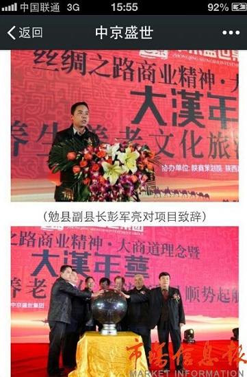 當(dāng)記者問起去年11月10日在曲江花費上百萬開新聞發(fā)布會的中心內(nèi)容。鄭總說:花費多少我不清楚,那是總公司辦的,當(dāng)時我們和漢中勉縣已經(jīng)簽約框架協(xié)議,第一步先投資一個億,打到漢中項目部賬戶上,我們都辦了,當(dāng)時現(xiàn)場簽約儀式是勉縣副縣長彭軍亮和旅游公司老總董建華簽的約,資金是我們?nèi)谫Y了2000萬。我從深圳借了8000萬籌得一個億,項目基本敲定,最后是高新一家公司跑路影響到我們兌現(xiàn),我才把錢抽了回來。勉縣溫泉養(yǎng)老度假村的項目我們還在積極努力一直聯(lián)系著呢。當(dāng)記者問到勉縣度假村你們?nèi)谫Y到多少資金呢?鄭總說我們勉縣項目只融資到400萬。但記者沒見到具有法律效力的文書。