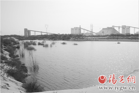 金雞灘煤礦自2012年開(kāi)工建設(shè),煤礦建設(shè)期間,將井下矸石傾倒在煤礦廠區(qū)外側(cè)的沙漠中,煤礦礦井水經(jīng)過(guò)煤礦內(nèi)部污水處理廠處理后,直接排放于煤礦北側(cè)不遠(yuǎn)處的沙漠中,排放形成三個(gè)面積較大的污水池,污水池都是用沙子簡(jiǎn)易圍砌而成,呈不規(guī)則長(zhǎng)方形狀,最大一個(gè)污水池長(zhǎng)可達(dá)300米,寬120米。三個(gè)污水池及周?chē)聺B形成的多個(gè)污水湖,累計(jì)面積約10萬(wàn)平方米,下滲的多個(gè)小湖,污水池水質(zhì)渾濁。浸泡在水中的植被大多已經(jīng)枯死,枯死的植被上附著著一些灰白色顆粒。金雞灘煤礦廠區(qū)堆放了大量的煤炭,通往煤礦儲(chǔ)煤場(chǎng)的路上運(yùn)煤車(chē)排成長(zhǎng)列,煤礦的兩個(gè)落煤倉(cāng)還在向運(yùn)煤車(chē)內(nèi)裝煤,每個(gè)落煤倉(cāng)裝備30多頓的一車(chē)煤僅需要1分鐘。