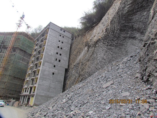 再往前行500米左右,還有兩處工程機(jī)械正在挖山,高中橋頭附近也已削山后建有兩棟高層,一處封頂11層,一處12層且正在施工。山體被垂直向下切開,樓房距山體不足1米,且兩幢高層中間還有滲水和滑落碎石。部分建筑物資的攪拌機(jī)堆放在路邊,對(duì)公路上來往車輛及行人安全帶來影響。