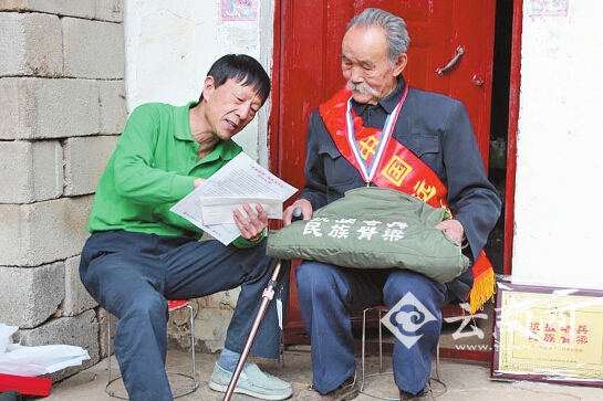 羊毛毯、馬甲、帽子、拐杖、T恤、代表榮譽的勛章、感謝信……,當(dāng)志愿者把刻有“抗戰(zhàn)老兵民族脊梁”的勛章戴到老兵楊體善和黨仁清的脖子上時,兩位老人都笑得很開心。這是全國志愿者在抗戰(zhàn)勝利70周年之際,向每位幸存的抗戰(zhàn)老兵送上的一份致敬大禮包。據(jù)悉,云南是第二批派發(fā)“老兵回家,致敬大禮包”的省份,該活動本月在我省拉開帷幕,志愿者將把622份大禮包陸續(xù)送到抗戰(zhàn)老兵手中。