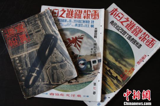 圖為此次發(fā)現(xiàn)的侵華日軍戰(zhàn)地畫報均為日文原版,包括一本《寫真周報》,兩本《畫報躍進(jìn)之日本》。黃鶴攝