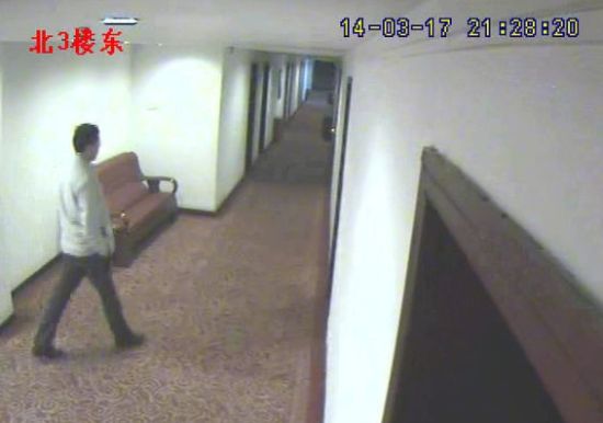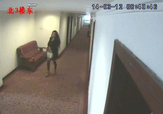 另一段視頻截圖顯示,2014年3月17日晚20:05,張某進(jìn)入該房間,隨后的21:28楊某進(jìn)入該房。一直到次日早晨8:20,二人才一前一后走出房間。