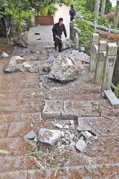 人行道被落石砸爛。