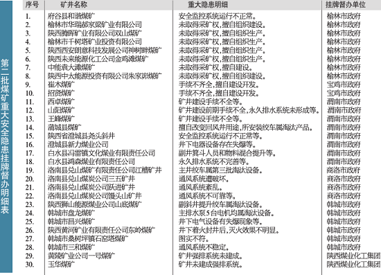 昨日,記者從各省安監(jiān)局獲悉,省安委會(huì)辦公室對(duì)第二批煤礦重大安全隱患掛牌督辦的名單進(jìn)行公布,涉及到榆林、寶雞、渭南、商洛市、韓城市等地。