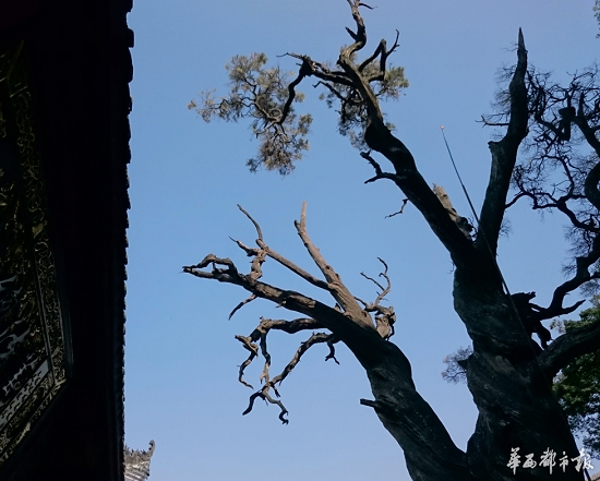 昨日上午,在瀘山光福寺內(nèi),游人如織。在大雄寶殿東側(cè),這棵編號(hào)XC0038的古樹看上去滿目瘡痍,虬枝盤曲,樹皮已經(jīng)完全脫落,碩大而干枯的柏樹枝干盡情地裸露在烈日下,樹干枝條末端零星地生長(zhǎng)著幾簇黃黃的柏樹葉。盡管古樹呈枯死的狀態(tài),還是吸引了不少游客拍照留念?!罢媸翘嫣亓?,還是第一次看見這么大的古樹。”站在樹下,來自成都的游客張林嘖嘖稱奇,“生命真是太頑強(qiáng)了!”