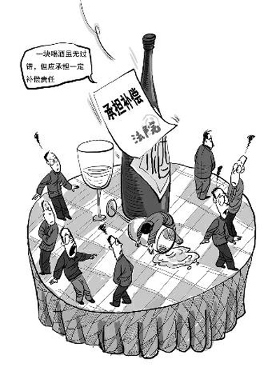 今年3月12日,法院依法判處宴請(qǐng)人王某對(duì)曹某的死亡承擔(dān)補(bǔ)償責(zé)任5000元;最后離席的何某、姚某等8人各承擔(dān)補(bǔ)償責(zé)任2500元;參與飲酒但離席較早的孫某等4人各承擔(dān)補(bǔ)償責(zé)任1500元;未飲酒且離席較早的李某承擔(dān)補(bǔ)償責(zé)任500元;駁回原告要超過(guò)補(bǔ)償數(shù)額部分的請(qǐng)求。