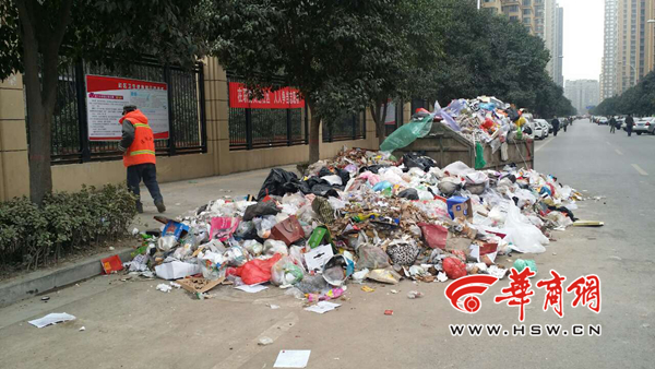 兩個(gè)大垃圾箱被塞得滿滿當(dāng)當(dāng)不說,垃圾還外溢到路面堆成山,最嚴(yán)重時(shí)甚至形成七八米長(zhǎng)的垃圾“河”,西安城西融僑城一期西門外的垃圾轉(zhuǎn)運(yùn)點(diǎn)讓周邊居民苦不堪言。