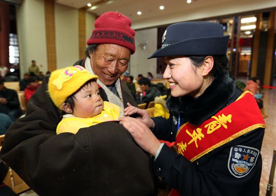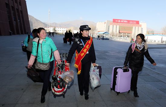 2月4日是春運首日,拉薩站迎來客流高峰。拉薩鐵路公安處為營造“安全出行、方便出行、溫馨出行”的乘車環(huán)境,從機關(guān)及各單位抽調(diào)30余名警力成立多個幫扶小組,多舉措為旅客提供安全保障。