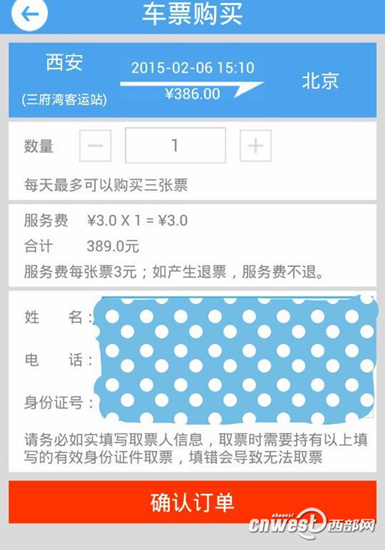 記者注冊了個人信息后,購買了一張西安三府灣客運站至北京市的車票,除了386元的票價以外,還需交3元服務(wù)費,并且有“服務(wù)費每張票3元;如產(chǎn)生退票,服務(wù)費不退。”的提示。