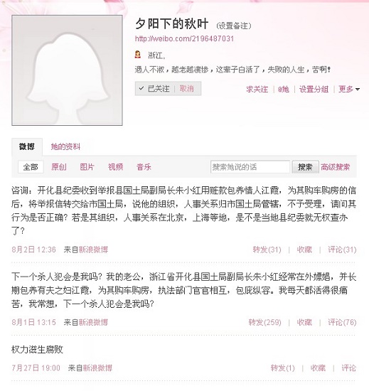2011年8月3日,一則“開化縣國土資源局副局長朱小紅包養(yǎng)情婦”的消息在微博上流傳開來,迅速引起關注,而發(fā)帖人正是該副局長的妻子林菁。