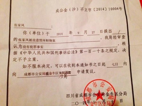 就此,成都市金牛區(qū)接警的派出所副所長(zhǎng)曾文才回應(yīng)澎湃新聞,稱接警后處理過程中,確實(shí)出具了“沒有犯罪事實(shí),不予立案”的證明。據(jù)其介紹,因此事涉及合同糾紛,屬于民事侵權(quán)行為,目前仍在建議當(dāng)事雙方協(xié)商解決中。