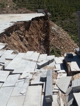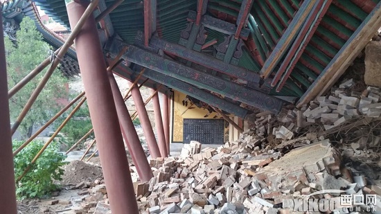 6月9日記者來到烏龍洞景區(qū)進(jìn)行采訪,在景區(qū)大門外立著一張警示牌,上面寫著(前方危險)四個大字,順著牌子望去一片塌陷區(qū)呈現(xiàn)在記者眼前,山溝砌起的圍壩有將近20米長已經(jīng)陷進(jìn),出現(xiàn)一個大大的豁口,用于裝飾的欄桿和石板都不見了蹤影,景區(qū)外面的圍墻,墻皮出現(xiàn)大面積脫了,大大小小的裂縫隨處可見,進(jìn)入景區(qū)記者看到,大殿,鼓樓,禪房等建筑都出現(xiàn)了裂縫,特別是靠近西面的建筑開裂尤其嚴(yán)重,在禪房的后墻有三條從上到下的裂縫有五六公分寬,整個景區(qū)的地面由于地基下沉變得凹凸不平。