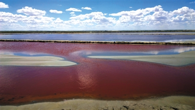 查漢淖爾湖湖面被一條堤壩分成南北兩部分,低洼的南側(cè)湖水較少,呈暗紅色,氣味較淡。北側(cè)湖水則幾乎溢出堤壩,暗黑色的湖水上漂浮著五顏六色的泡沫,泡沫里面時隱時現(xiàn)一些腐爛鳥兒的尸體,一股臭味撲面而來。