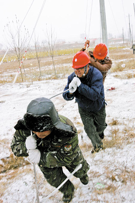 高寒地帶的錫林郭勒有效施工期短,圖為太仆寺電力公司職工在2013年寒冬施工場景。