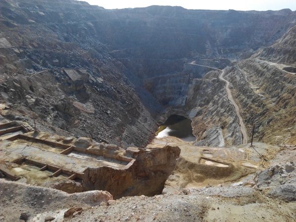山路上,連綿的灰白裸巖和黃綠色的廢渣看得人心生蒼涼。深部銅礦巨大的礦坑還在那里,積水囤積在底部,陽(yáng)光下泛著粼粼的光。
