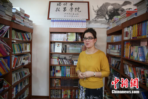塔什干孔子學(xué)院烏方院長海颯鷗向記者介紹孔子學(xué)院圖書資料情況。文龍杰攝