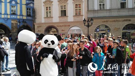 5月2日,布拉格老城廣場的四川中心前游人如織,作為四川旅游布拉格路演形象的4個熊貓人偶一出現(xiàn),立刻吸引眾多游客目光。很多游客上去與“熊貓”合影,不同口音的“Sichuan”、“Panda”聲音此起彼伏,配合電車和站臺廣告,四川旅游旋風(fēng)般的躥紅布拉格。