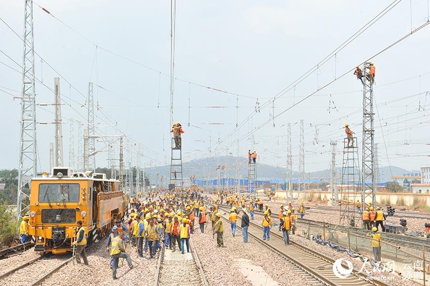 3000多名建設(shè)者進行線路撥接,將滬昆鐵路、南昆鐵路、以及中越、中老國際鐵路國內(nèi)段等連接到該車站,實現(xiàn)上述鐵路間的互聯(lián)互通,云南鐵路貨運能力大幅提升。(張偉明 攝)
