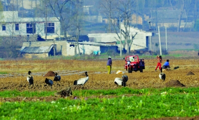一邊趕著牛車,一邊朝地上撒金燦燦的玉米,等鶴來食,這樣的工作他一干就是20年。