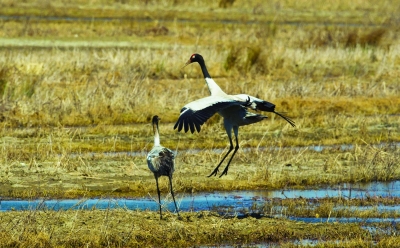 作為草海自然保護區(qū)管護員,臧爾軍從1997年起,過著與鶴為伴的日子。在他心中,黑頸鶴幾時來、呆多久、何時走清楚得很,唯一猜不到的是數(shù)量?!坝行┠陙韼装僦?,有些年又有一千多只?!比ツ觑w到草海來越冬的黑頸鶴數(shù)量著實令人驚喜,“去年11月份陸續(xù)飛來,僅胡葉林片區(qū)就來了1500多只,整片海域估計有1800多只,比上一年多得多?!?