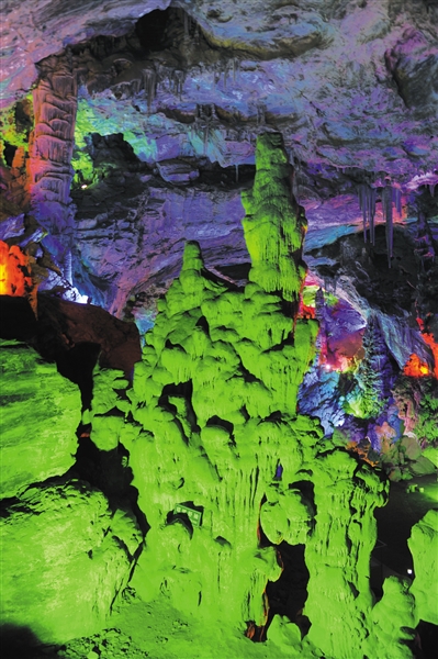 巨大的石筍、石柱巍然聳立,站在“大廳”中央天然形成的小石橋看,橋下一片相當(dāng)大面積的邊池。走近邊池,走上小石橋,站在橋上看風(fēng)景。依托這些形態(tài)各異的鐘乳石,打著不同明暗色彩的燈光,給這些本就讓人目瞪口呆的景致更加增添了夢(mèng)幻色彩。