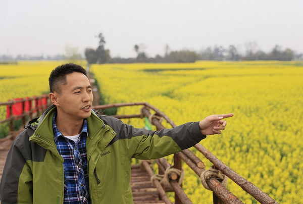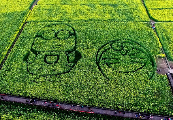 3月12日,四川廣安,在四川省廣漢市西高鎮(zhèn),大學(xué)生村官李嘉佳等人在油菜花田里“種”出的“機(jī)器貓”、“kitty貓”、“小黃人”、“大白”及“青銅大立人”等圖案,引來(lái)不少游客觀賞、拍照。