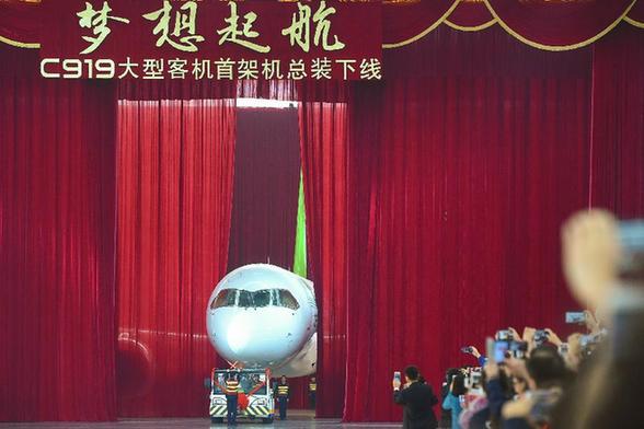 這是我國自主研制的C919大型客機首架機在中國商飛公司新建成的總裝制造中心浦東基地廠房內(nèi)正式下線(2015年11月2日攝)。新華社記者 裴鑫 攝