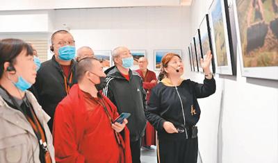 內(nèi)蒙古明長城科普攝影展在內(nèi)蒙古展覽館開展,高曉梅(右一)向觀眾做介紹。