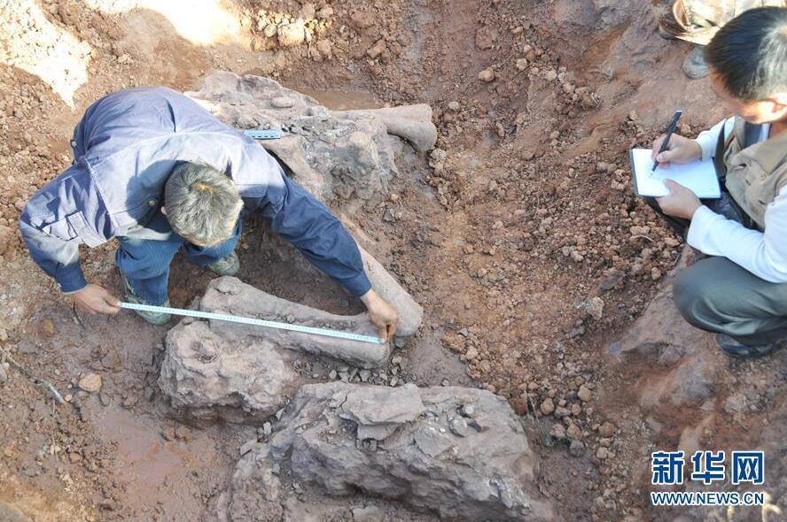 工作人員在測量一具上個月新發(fā)現(xiàn)的恐龍化石并記錄數(shù)據(jù)。據(jù)了解,1938年分別在祿豐縣金山鎮(zhèn)沙灣村與大沖村發(fā)現(xiàn)距今1.8億年的恐龍化石,后經(jīng)楊鐘健教授研究,命名為“許氏祿豐龍”和“巨型祿豐龍”,它們是侏羅紀(jì)早期最早出現(xiàn)的恐龍之一。新華社記者姚兵攝圖片來源:新華網(wǎng)