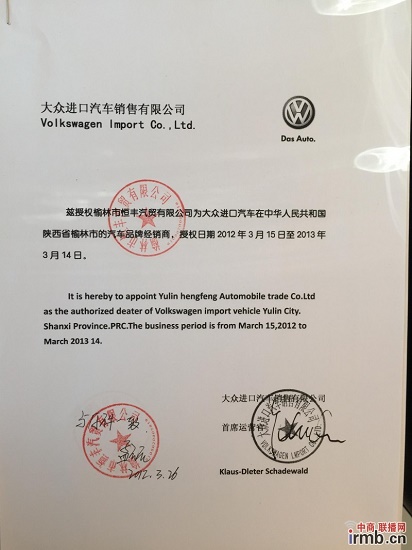 李主任隨后向記者提供了榆林恒豐汽貿有限公司提供給管委會的“進口大眾汽車”授權書復印件。該授權書載明:茲授權榆林市恒豐汽貿有限公司為大眾進口汽車在中華人民共和國陜西省榆林市的汽車品牌經銷商,授權日期2012年3月15日至2013年3月14日。簽發(fā)單位為:大眾進口汽車銷售有限公司,簽發(fā)人為:首席運營官。這份授權書沒有任何編號和簽發(fā)日期。該復印件注明:此件與原件一致,孟某某。提供給榆林汽車產業(yè)園區(qū)管委會的時間為2012年的3月26日。
