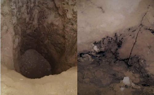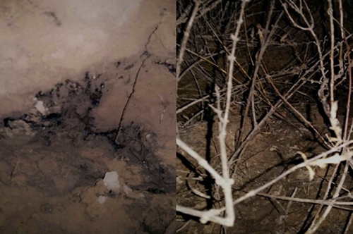 泄漏地點位于吳堡村山上,現(xiàn)場一片狼藉,泄漏清理情況不容樂觀,部分泄漏原油因未清理徹底,熠熠發(fā)亮;部分土埋表層可現(xiàn)滲透油印,印跡斑斑,隱患一觸即發(fā)?,F(xiàn)場處理沒經(jīng)過當?shù)丨h(huán)保局的監(jiān)督,私自采取了草率掩埋的土辦法,一輛油污漬漬的裝載機停在現(xiàn)場。