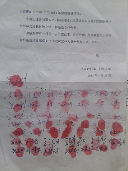 2015年5月25日,經(jīng)過(guò)長(zhǎng)時(shí)間與板定梁塔煤礦的協(xié)商、爭(zhēng)取等后沒(méi)有取得任何結(jié)果,反而受到煤礦方面的毆打的威脅后,村民無(wú)奈之下針對(duì)煤礦礦長(zhǎng)苗成良涉嫌挪用侵占集體巨額資金、行賄、偷稅漏稅以及違法占地修建黑煤場(chǎng)等行為向當(dāng)?shù)毓?、?guó)土及稅務(wù)等部門進(jìn)行了舉報(bào)和報(bào)案。同時(shí),也將原煤炭局長(zhǎng)、副縣長(zhǎng)楊自力涉嫌充當(dāng)板定梁塔煤礦保護(hù)傘相當(dāng)?shù)丶o(jì)檢部門舉報(bào)。