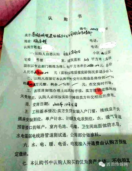 2015年11月17日,筆者跟隨反映情況群眾來到姚店朝陽小區(qū)售樓中心了解情況。售樓中心負(fù)責(zé)人說:“現(xiàn)在房子基本賣完了,剩不多了,要買就盡快。房價(jià)每平米2700多,簽訂購房合同后每平米再交300元土地流轉(zhuǎn)費(fèi),好給你們辦理房產(chǎn)證。”