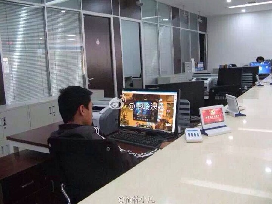 據(jù)該網(wǎng)友提供的照片顯示,在一政務(wù)大廳工作臺內(nèi)側(cè),有一名男子坐在電腦前操作電腦,其電腦屏幕上顯示的頁面類似一種網(wǎng)絡(luò)游戲畫面。