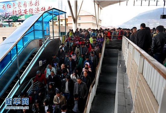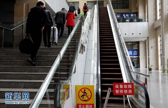 11月6日,眾多旅客通過樓梯出站,一旁的扶梯仍處“暫停使用”狀態(tài)。陜西省延安火車站進出站的“日立”手扶電梯,自今年7月初以來一直因“設備故障,暫停使用”而靜靜地躺在那里,旅客多方投訴也無濟于事。新華社于2013年12月根據(jù)群眾投訴,曾報道過該車站的扶梯“一直在維修”。報道發(fā)出幾天后,扶梯即“修好”運行。對于電梯再次“故障”,旅客反應強烈,是怕安全事故“因噎廢食”,還是設備“豆腐渣”?11月6日,記者就此詢問車站方,答復:“有關方面已經(jīng)將維修電梯的款項付給‘日立’電梯方了,目前他們正在備料。”詢問何時能維修好,讓旅客用上扶手電梯,回答:“我們也無從知曉,不能回答?!毙氯A社記者陶明攝