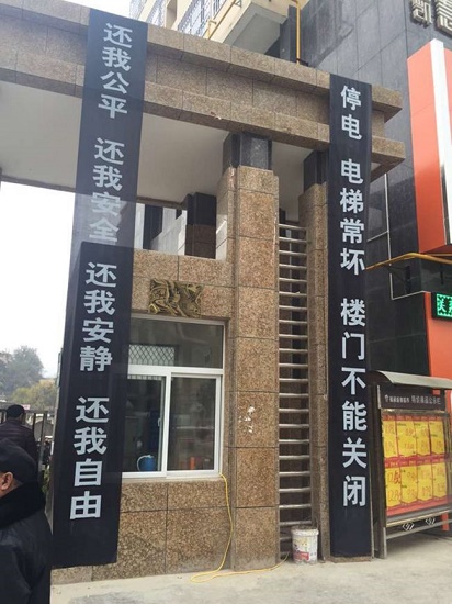 小區(qū)大門口懸掛著的兩條維權(quán)橫幅
