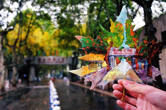 樹葉上畫著校園某處的風(fēng)景
