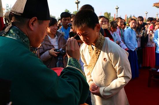 在開筆禮上,記者看到,學(xué)堂的新生及老師們正衣冠、拜圣賢、誦經(jīng)典、表志向......隨后,老師在學(xué)童的額頭正中點(diǎn)上朱砂,寄寓學(xué)子們?nèi)蘸蟮膶W(xué)習(xí)能一點(diǎn)就通。最后,學(xué)子們手執(zhí)毛筆,在宣紙上寫下“人”字,寓示著孩子們工工整整寫字,端端正正做人,先做人,再做事。