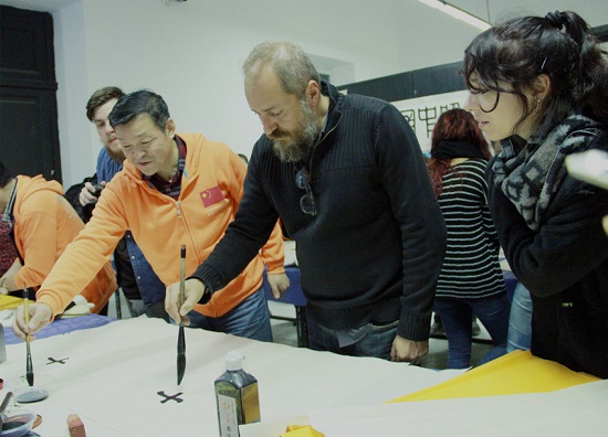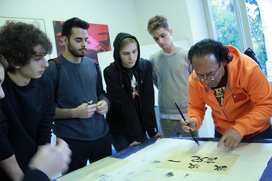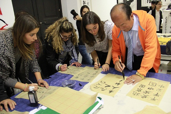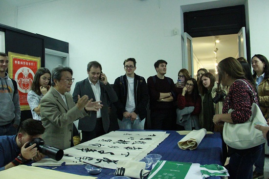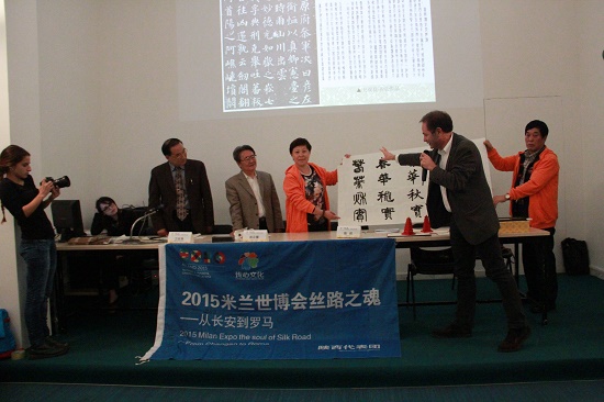 意大利時間2015年10月26日下午3點,“2015米蘭世博會絲路之魂—從長安到羅馬”陜西代表團團長陳莉女士、著名書法家肖云儒先生、衛(wèi)雙良先生、劉寧亞先生、辛建社先生、唐占魁先生、萬廣輝先生一行幾人走進歐洲設計學院進行一系列書法文化交流,開展書法講座,參觀院校并進行了現(xiàn)場書法展演。陜西著名書法家肖云儒和衛(wèi)雙良先生分別從“中國書畫美學特征”和“中國文字與書法”主題做了生動的演講,與師生們開展文化互動。在意大利國家電視臺特別顧問蓋特先生的主持下,歐洲設計學院羅馬分校校長AntonioVenece先生、意大利導演保羅先生、華人聶紅梅女士和歐洲設計學院師生等近百人均參加了此次活動。