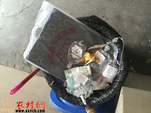 10月29日,筆者根據(jù)網(wǎng)友所述,來(lái)到大荔縣中醫(yī)醫(yī)院調(diào)查了解。在大荔縣中醫(yī)醫(yī)院門診二樓,眼科門診的長(zhǎng)條椅子旁邊有個(gè)套著黑色塑料袋的紅色垃圾桶,這個(gè)垃圾桶里除了生活垃圾外,記者發(fā)現(xiàn)有兩根屬于針灸用的小細(xì)銀針與醫(yī)用棉簽。在二號(hào)樓通往住院部的走廊上,觀察室門邊的生活垃圾桶內(nèi),除了有生活垃圾外,還有病人的CT片,更醒目的是有幾個(gè)輸完液的吊瓶以及廢棄的輸液管和輸液針頭。在住院部一樓診療室內(nèi)記者發(fā)現(xiàn)醫(yī)護(hù)人員將用過(guò)的藥盒、藥瓶、注射器未經(jīng)分類隨地亂扔。