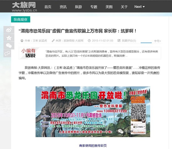 同時(shí),不少家長都向記者抱怨,該展覽就是拿孩子賺錢的“坑爹”展覽。就是這些假的宣傳語,假的圖片,誤導(dǎo)了渭南市上萬家長。因?yàn)?,在這個(gè)世界上,絕大多數(shù)的家長,都會(huì)把孩子的未來看成是自己的未來,“恐龍科普展”多么有意義的一次親子體驗(yàn),卻成了欺騙孩子們的籌碼。可是作為經(jīng)開區(qū)管委會(huì)對此次活動(dòng)又做了那些了解,組織者的背景是否知曉。