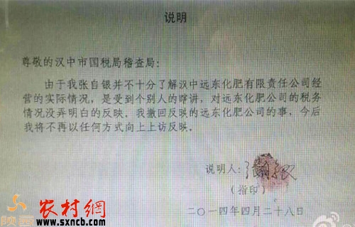 2014年4月28日,張自銀給漢中市國稅局稽查局寫的不再上訪的說明