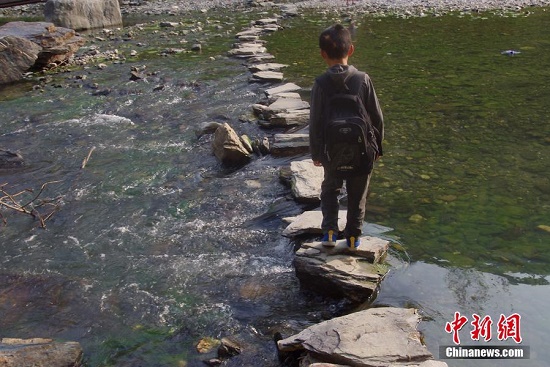 踩石頭過(guò)河上學(xué)的孩子。村民王軍稱,現(xiàn)在孩子們可以踩著石頭過(guò)河,但一到汛期河水寬達(dá)百米,村民們修建的簡(jiǎn)易橋年年都會(huì)被洪水沖毀,遇到上游漲水很危險(xiǎn)。圖片來(lái)源:視覺(jué)中國(guó)