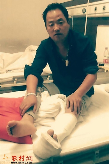 2015年10月23日中午,記者來(lái)到位于文林路上的延安大學(xué)咸陽(yáng)醫(yī)院(二十局醫(yī)院),見(jiàn)到了求助的42歲西郭村村民的張鋒,此時(shí),張鋒正躺在床上,左腳兩處嚴(yán)重骨折剛做完手術(shù)。說(shuō)到被打的事情,張峰一臉的委屈。他說(shuō)最近他的侄子在離村子不遠(yuǎn)的工地里承包了工程,他便在那里打工,可在施工過(guò)程時(shí),村支書(shū)張某帶人在工地阻擋,迫使工地施工時(shí)常終斷。