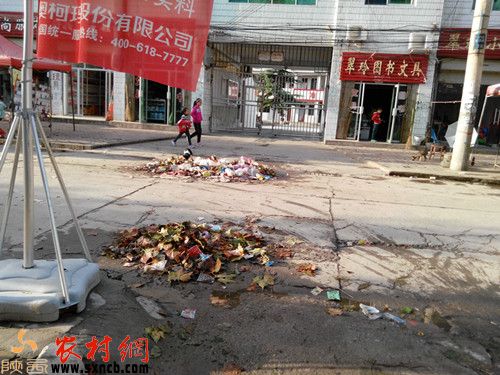 更令人不可思議的是:零口街道辦的大門口的一角,放著2個(gè)綠色的垃圾箱,在垃圾箱周圍,卻是灑落滿地皆垃圾的凌亂景象。從零口街道辦向西而行,每50米就是1攤垃圾,而且垃圾遍布的距離絕對是標(biāo)準(zhǔn)化的。