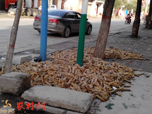 零口街辦二馬路東,路南的玉米芯堆積路邊