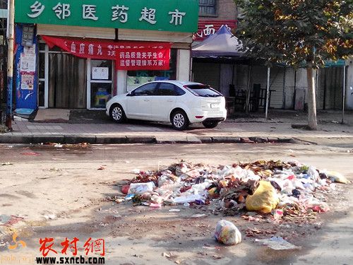 最顯眼的生活垃圾堆約有7、8平米,竟然出現(xiàn)在街道三岔口的正中間,與相鄰醫(yī)藥超市門前遙遙相對。