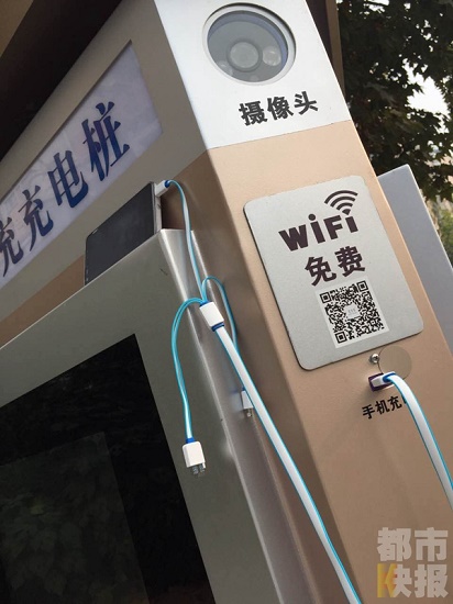 同時(shí),記者還看到一串接口,插在手機(jī)上也能充電,用微信掃下二維碼之后,這里的無線WIFI就接通了,上網(wǎng)也很方便。