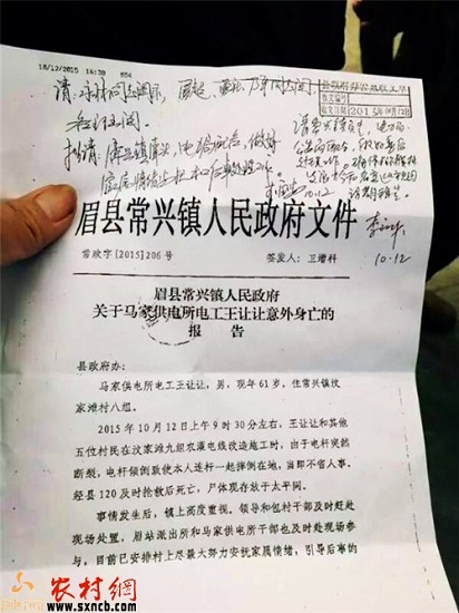 死者王讓讓的女兒王維妮告訴記者:“我父親意外死亡已經(jīng)過去近10天了,眉縣供電分公司的領(lǐng)導(dǎo)沒有到我們家里來看望過家屬,我們多次找眉縣供電分公司領(lǐng)導(dǎo)和政府林丹高,對于我父親的后事怎么處理,沒有一個領(lǐng)導(dǎo)表態(tài),我們現(xiàn)在也不知道怎么辦了,我父親的遺體現(xiàn)在還在眉縣醫(yī)院太平間放著?!蓖蹙S妮給記者提供了眉縣常興鎮(zhèn)給眉縣政府辦關(guān)于馬家供電所電工王讓讓意外死亡的報告,報告上眉縣多位領(lǐng)導(dǎo)批示,但時至今日,也沒有見到眉縣領(lǐng)導(dǎo)的批示起作用,死者王讓讓的后事,依然無人管,眉縣電力分公司的做法讓死者家屬感到憤怒和心寒。